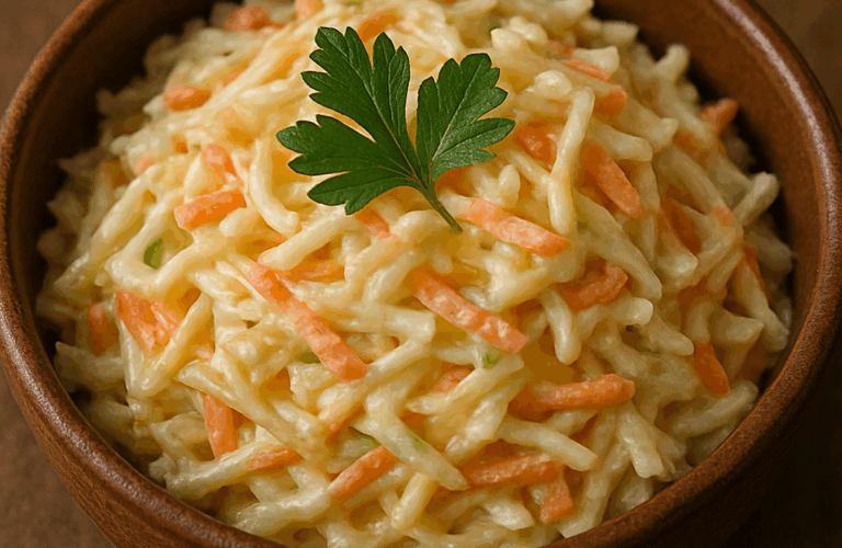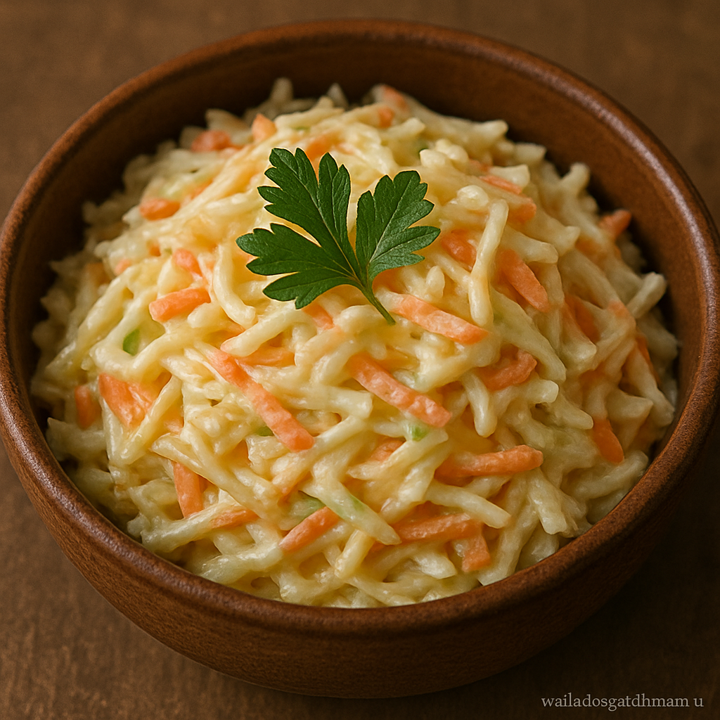 Chrupiąca surówka coleslaw na bazie białej kapusty, marchewki i cebuli, z klasycznym sosem majonezowo-jogurtowym. Idealny dodatek do obiadu, kanapek czy grilla.